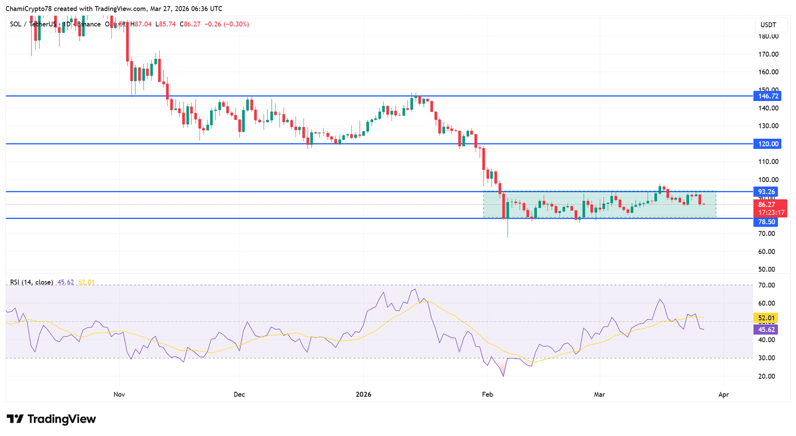 Preisaktionsshows SOL Halten innerhalb einer definierten Konsolidierung zwischen der 78,50-Dollar-Unterstützung und dem 93,26-Dollar-Widerstand nach dem Durchbruch von höheren Niveaus. Dieser Bereich spiegelt eher eine Stabilisierungsphase als eine bestätigte Umkehr wider, da Käufer niedrigere Niveaus verteidigt haben, es ihnen jedoch nicht gelungen ist, die Kontrolle über den Widerstand zurückzugewinnen.