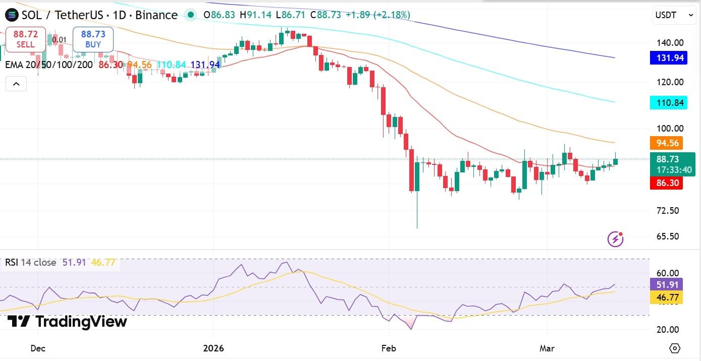 Zum Zeitpunkt der Drucklegung wurde SOL bei 89 US-Dollar gehandelt, was einem Anstieg von 4,83 % auf dem Tages-Chart und 2 % auf der Woche entspricht und gleichzeitig seinen kurzfristigen gleitenden EMA20-Durchschnitt umdreht.