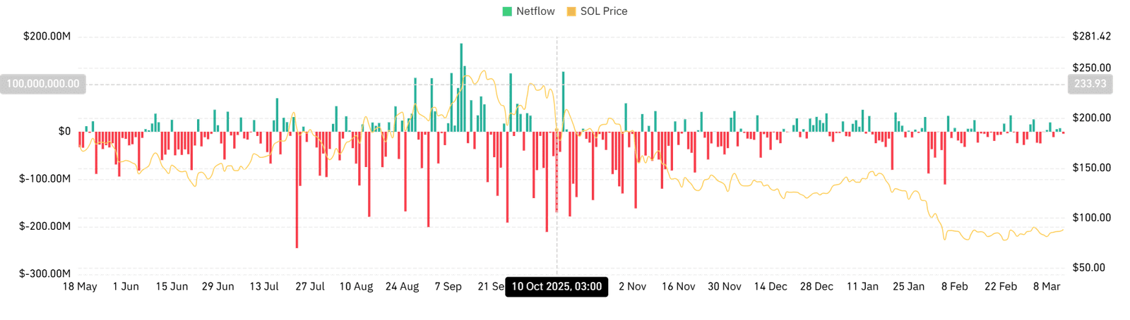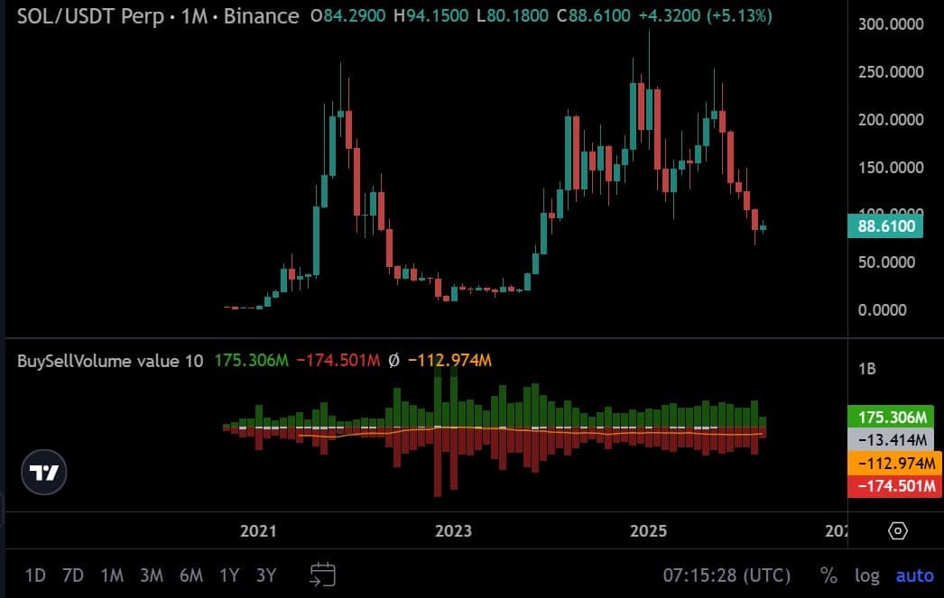 Allerdings bleiben die Verkäufer äußerst aktiv und die Käufer halten sich kaum über ihnen, wie das Kauf- und Verkaufsvolumen zeigt. Im letzten Monat verzeichnete Solana ein Kaufvolumen von 175 Millionen und ein Verkaufsvolumen von 174 Millionen.