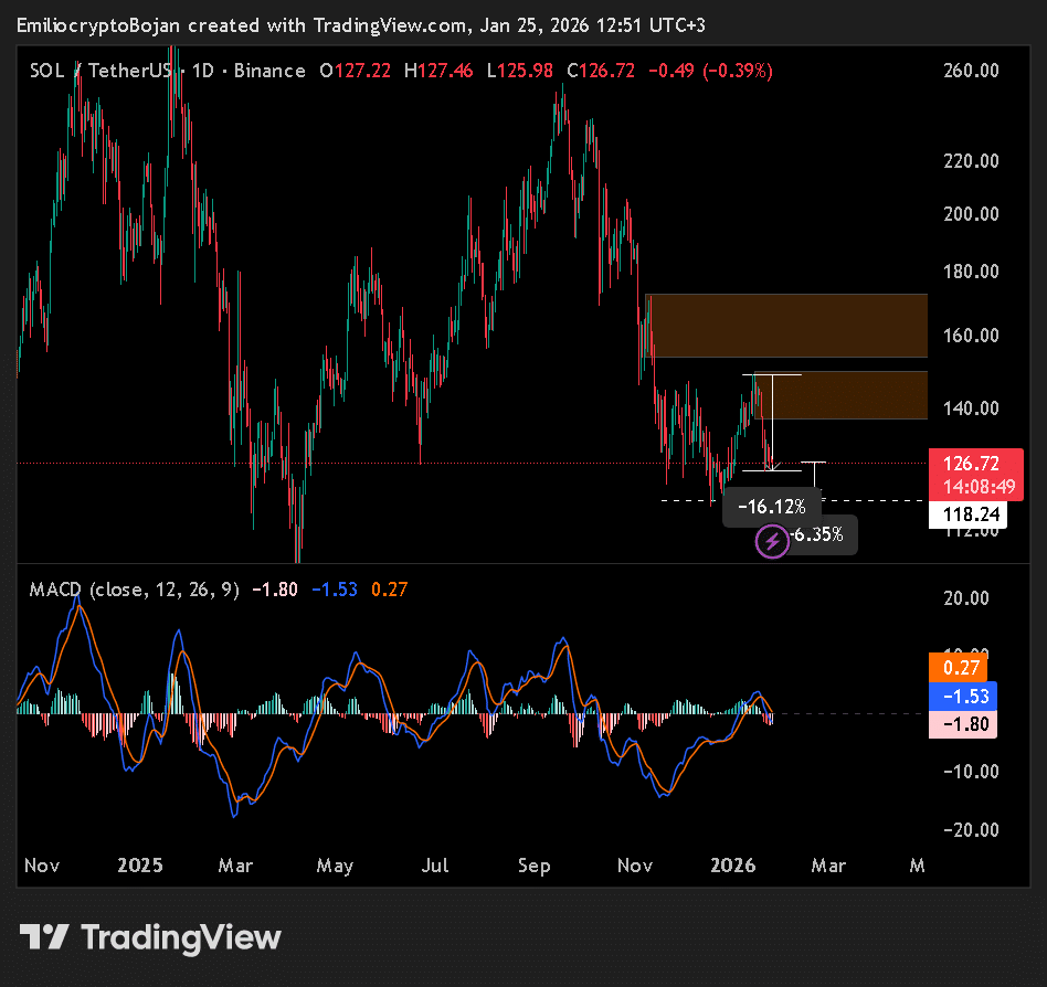 Solana startete mit einem starken Anstieg von 20 % in das Jahr 2026, doch am 25. Januar ließ die Dynamik schnell nach. Der Preis fiel um fast 16 %, nachdem er den Widerstand von 145 $ nicht zurückerobern konnte, und rutschte in Richtung der Zone von 126 $ ab.