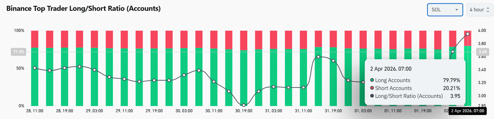 Dadurch stieg das Long/Short-Verhältnis auf 3,95, was eine aggressive Positionierung widerspiegelt.