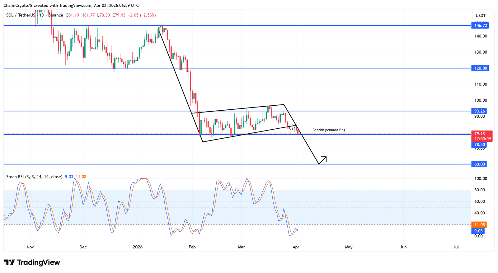 Aufgrund dieses Drucks brach SOL unter seinen rückläufigen Wimpel nahe der 80-Dollar-Marke ein und bestätigte damit die Fortsetzung der Konsolidierung.