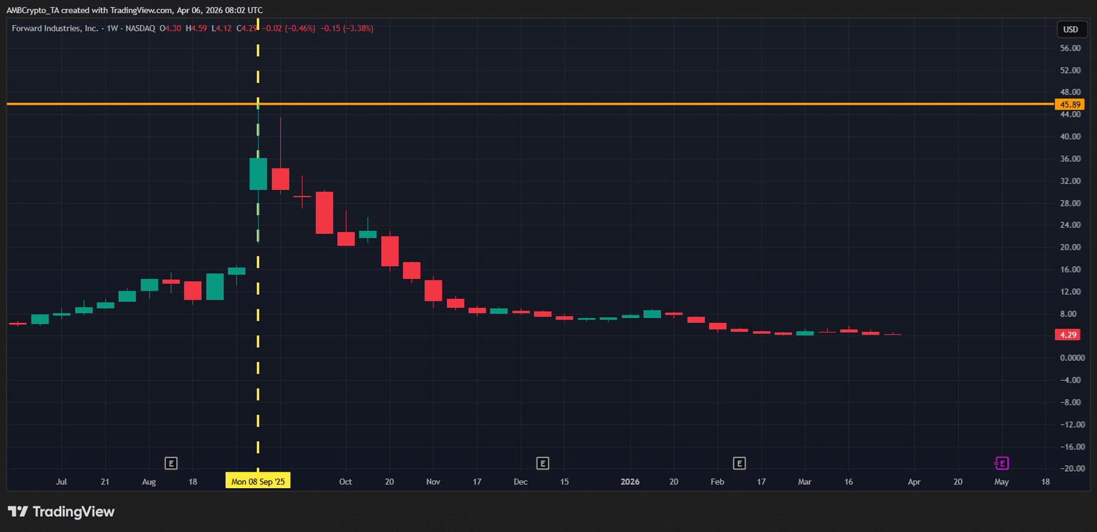 Nehmen wir zum Beispiel den größten SOL DAT, Forward Industries (NASDAQ: FWDI). Es liegt immer noch über 80 % unter dem Niveau vor dem Absturz im Oktober.