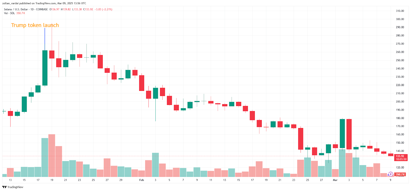 SOL ist derzeit seit dem Start von Trumps offiziellem Trump (Trump) Token um 49% gesunken, von 261 US -Dollar am 18. Januar auf 133 US -Dollar am 9. März.
