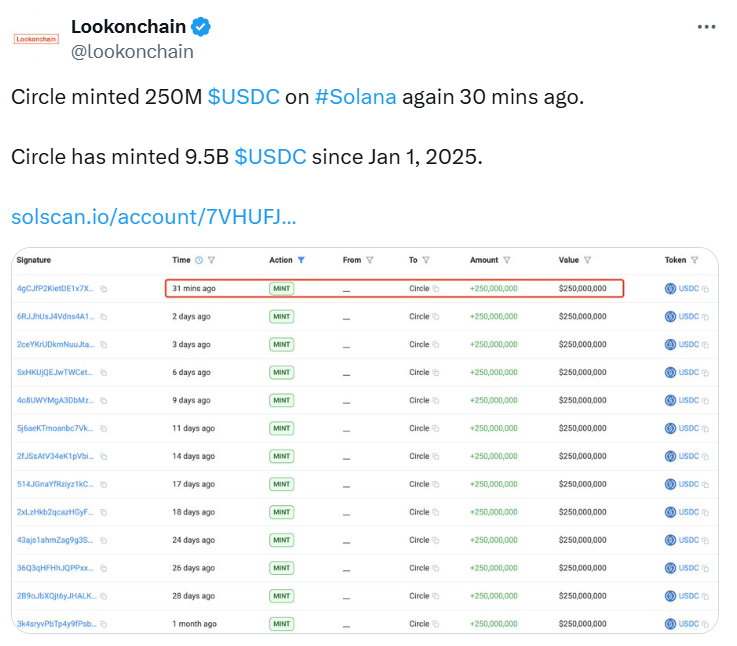 Darüber hinaus konnte Solana diesen Abwärtstrend nicht brechen, obwohl sie neu geprägte USDC im Wert von über 9,5 Milliarden US -Dollar verzeichnet haben (USDC) Stablecoins seit dem 1. Januar 2025,, nach zur Crypto Intelligence -Plattform Lookonchain.