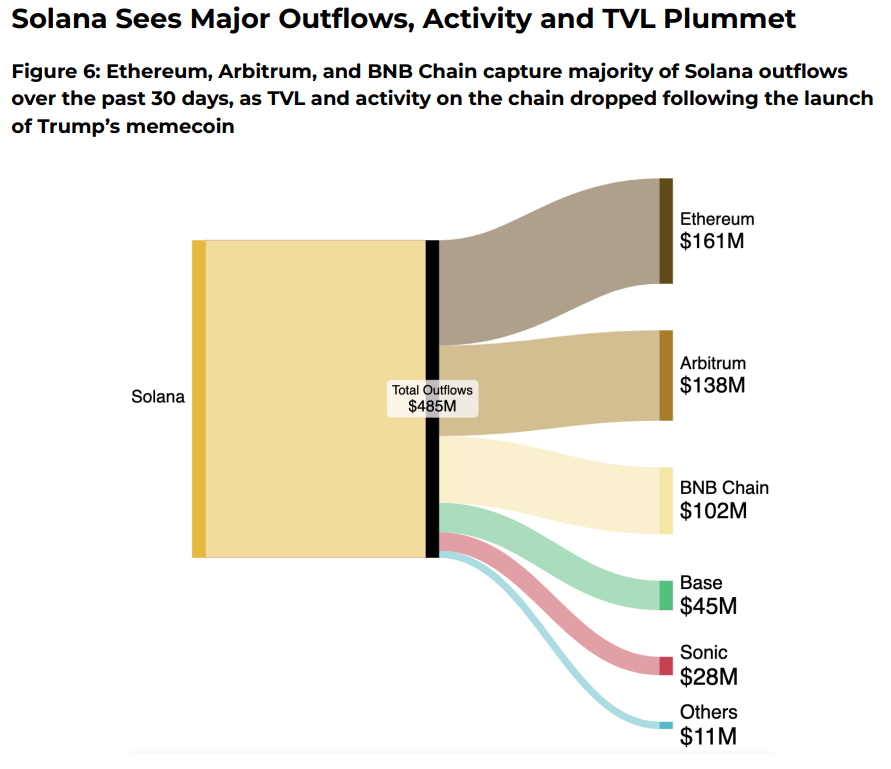 Solana wurde im Februar von Abflüssen im Wert von über 485 Millionen US -Dollar betroffen, wobei Investor Capital hauptsächlich nach Ethereum, Arbitrum und der BNB -Kette floss.