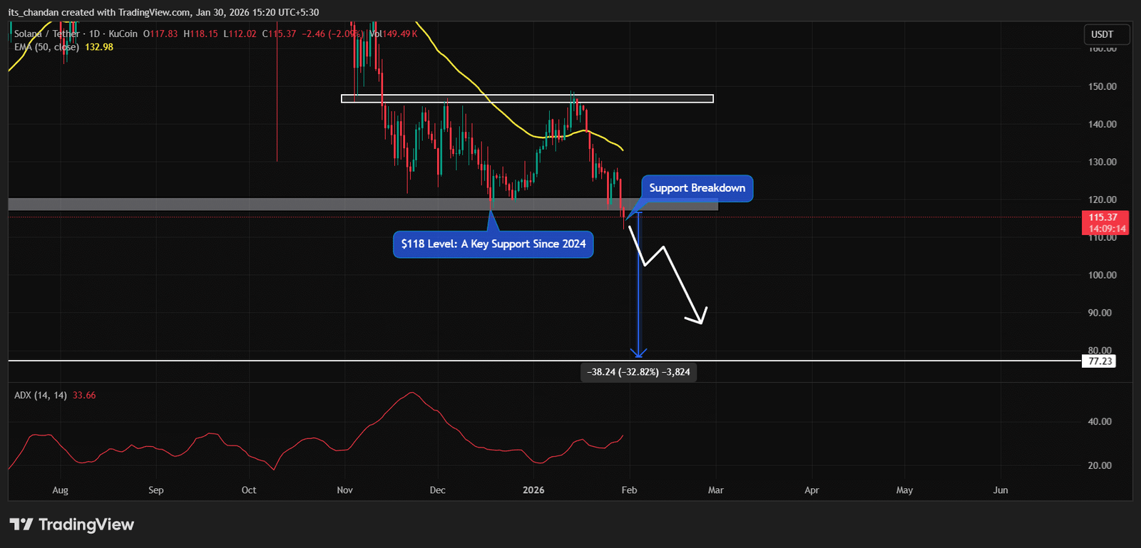 Ein Blick auf die Preisdiagramme zeigt, dass SOL eines seiner stärksten wichtigen Unterstützungsniveaus bei 118 US-Dollar verloren hat, das es seit März 2024 gehalten hatte.