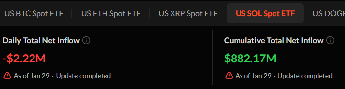 Laut On-Chain-Analyseplattform SoSoValueDie in den USA ansässigen Solana Spot Exchange Traded Funds (ETFs) verzeichneten einen erheblichen Abfluss von 2,22 Millionen US-Dollar. Dies deutet darauf hin, dass Anleger und Institutionen Kapital aus dem zugrunde liegenden Vermögenswert abziehen.