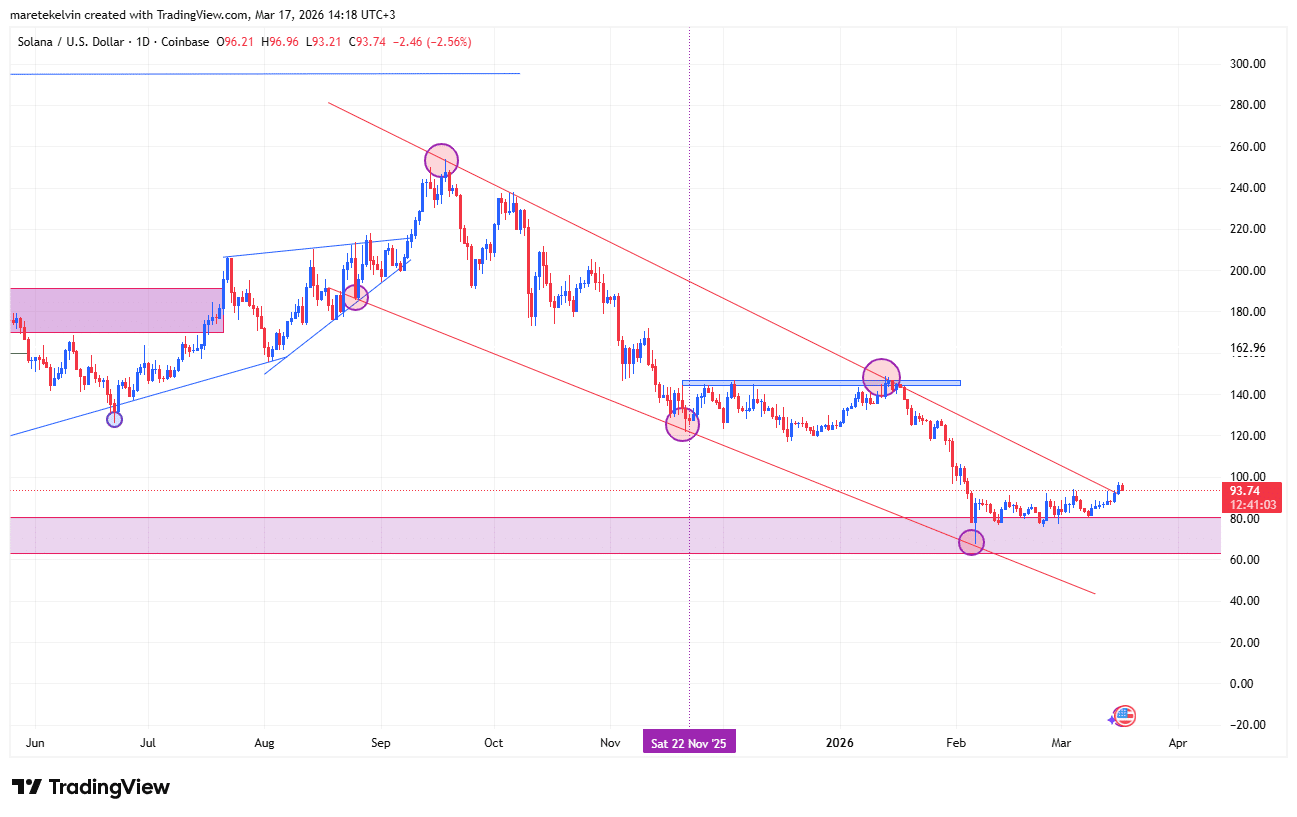 Auf dem Tages-Chart brach SOL aus einem Keilkonsolidierungsmuster aus, was auf eine mögliche Trendwende hindeutet. Zum Zeitpunkt der Drucklegung wurde SOL nach einem kurzfristigen Rückgang nahe 93,74 US-Dollar gehandelt.