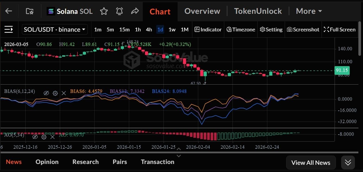 Zum Zeitpunkt dieses Schreibens wurde SOL bei 90,76 $ gehandelt, was einem Anstieg von 5,07 % auf dem Tages-Chart entspricht und zu seinen wöchentlichen Zuwächsen von 3 % beitrug. Inmitten dieser dünnen bärischen Struktur haben institutionelle Anleger Druck ausgeübt und versucht, den Druck aufzufangen.