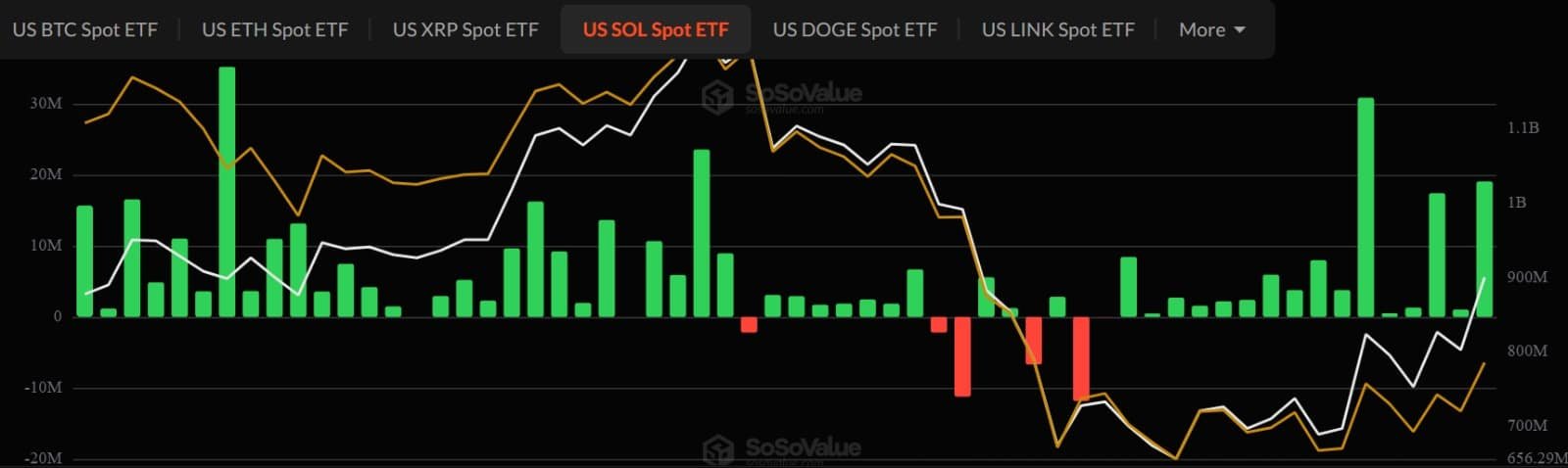 Zunächst einmal verzeichneten Solana-Spot-ETFs erhebliche und anhaltende Kapitalzuflüsse und verzeichneten an drei aufeinanderfolgenden Tagen Nettozuflüsse.