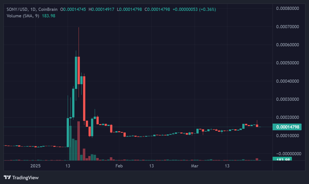 Trotz der Nachrichten ist der Token Sony von Sony in den letzten 24 Stunden um 17% gesunken, der derzeit bei 0,0001 USD unterteilt ist, wo es nach dem starken Rückgang des Januar-Höhepunkts von 0,0007 USD konsolidiert wurde.