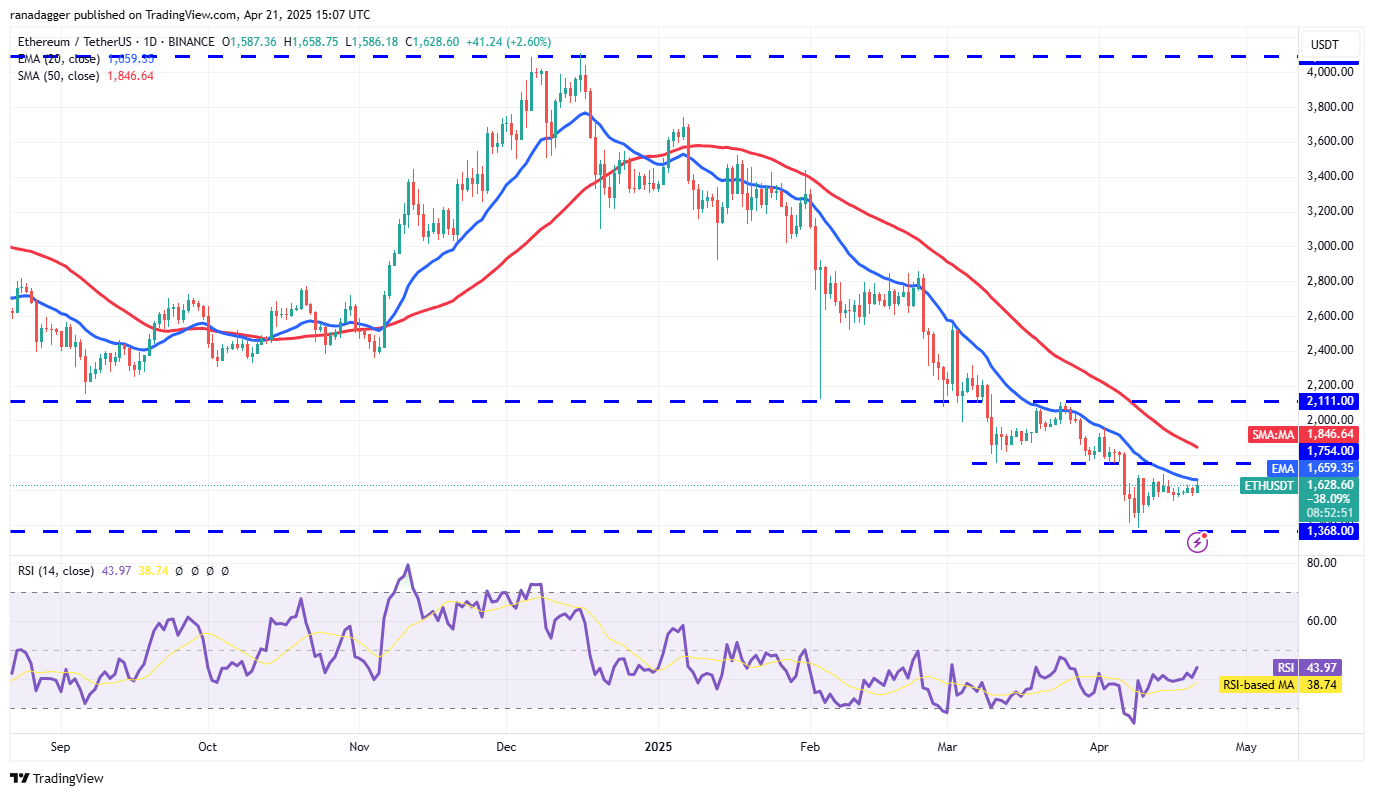 Äther (Eth) bleibt in einem Abwärtstrend, aber die Bullen versuchen, eine Relief-Rallye zu beginnen, indem sie den Preis über die 20-tägige EMA (1.659 US-Dollar) überschreiten.