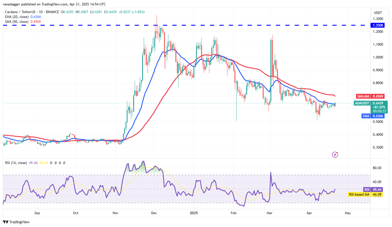 Die Bullen versuchen, Cardano zu pflegen (Ada) über der 20-tägigen EMA (0,63 USD), die ein Comeback signalisiert.