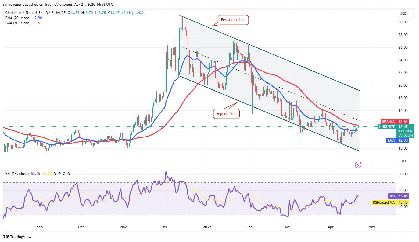 Chaainlink (LINK) über dem 20-tägigen EMA (12,90 USD) am 19. April geschlossen und hat die 50-Tage-SMA (13,63 USD) erreicht.