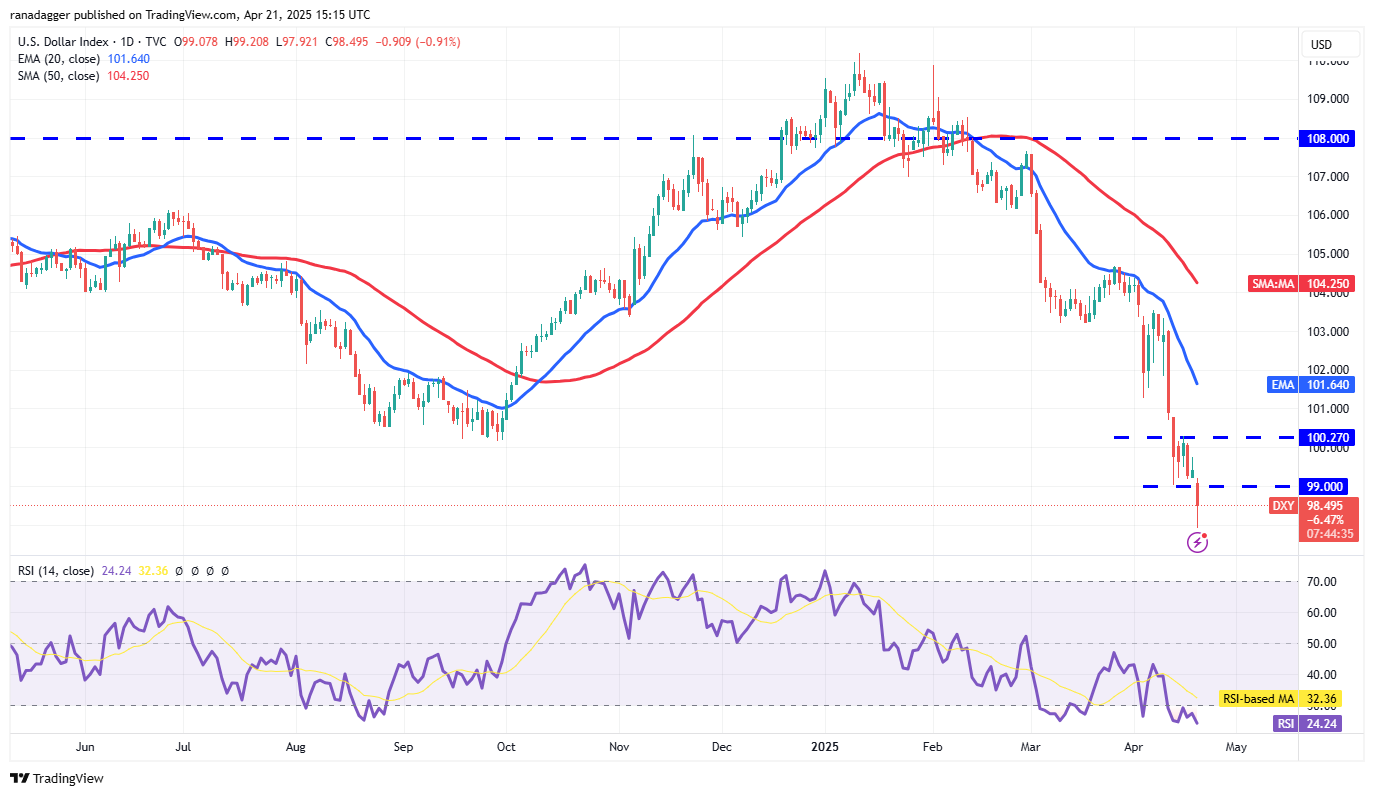 Der US-Dollar-Index (DXY) stürzte am 21. April unter das Niveau von 98 und fiel auf ein Tief von drei Jahren. Das katapultierte Gold auf ein neues Allzeithoch und Bitcoin (BTC) Auch zeigte Kraft, stieg über 88.000 US -Dollar.