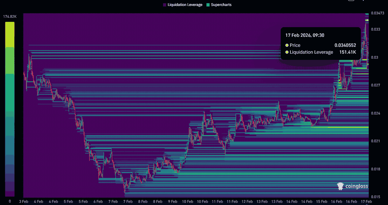 - Ein Liquiditätscluster von 151.000 US-Dollar nahe 0,034 US-Dollar legt dieses Preisniveau als nächstes Ziel fest.