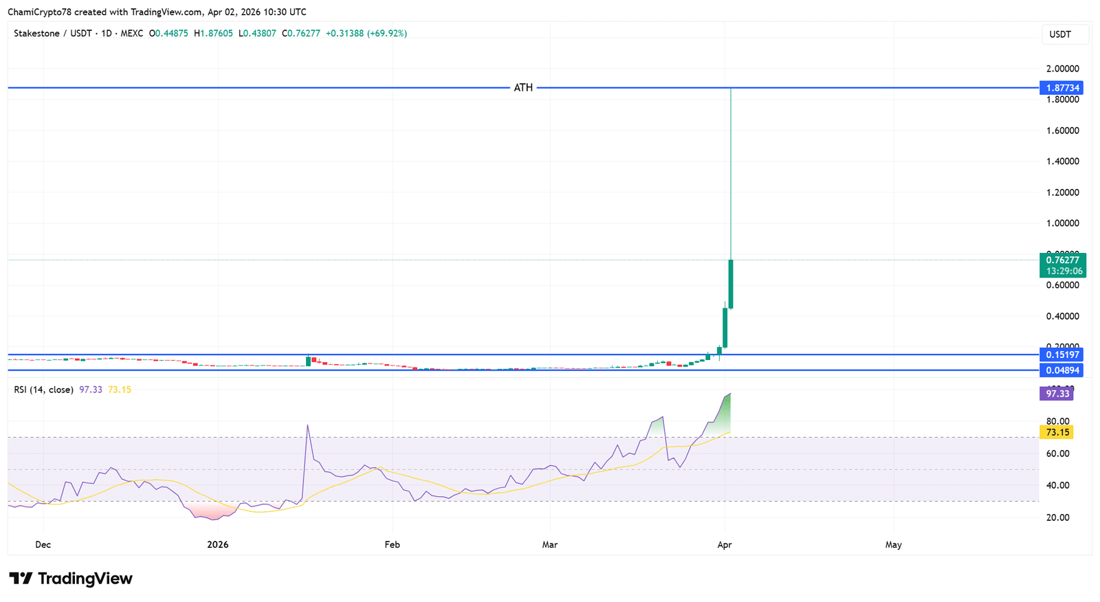 Zusammenfassend lässt sich sagen, dass die Rallye von StakeStone eine aggressive Expansionsphase widerspiegelte, die schnell in eine liquiditätsbedingte Korrektur überging, nachdem der Kurs nahe der 1,87-Dollar-Marke abgelehnt wurde.