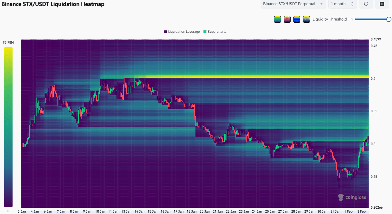 Die Liquidationskarte stimmte mit den zuvor identifizierten Versorgungszonen überein. Die 0,34 $ und 0,40 $ waren ebenfalls magnetische Zonen für den Preis. Beim STX könnte es auf beiden Niveaus zu einer rückläufigen Reaktion kommen, insbesondere auf dem Monatshoch.