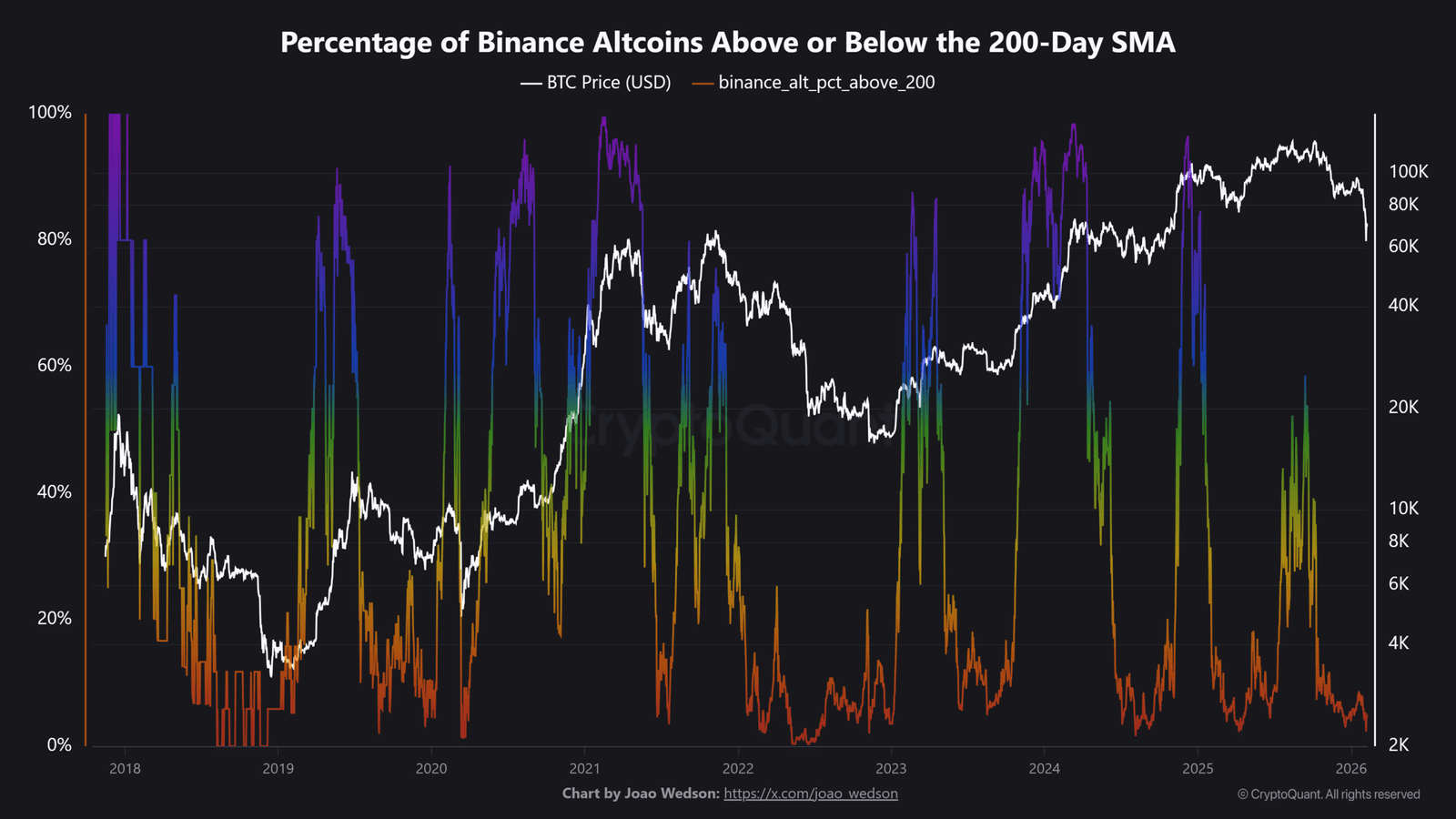 Tatsächlich lagen zum Zeitpunkt der Drucklegung weniger als 5 % der Altcoins an der Binance-Börse über dem gleitenden 200-Tage-Durchschnitt (SMA) – ein wichtiger Indikator für die Aufwärtsdynamik.