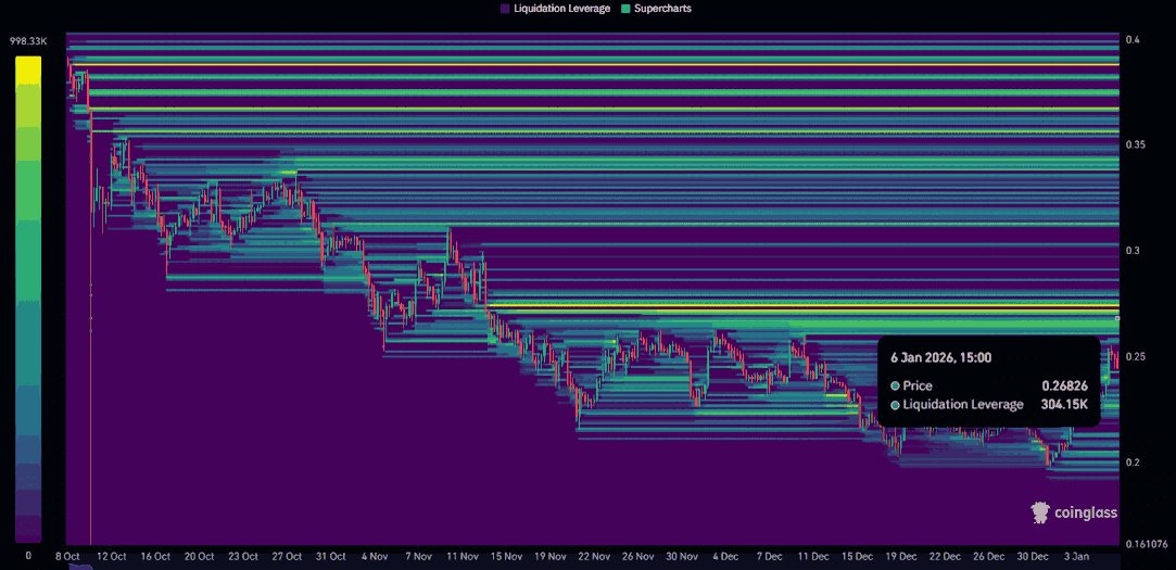 Eine entscheidende Bewegung über den Widerstand von 0,261 $ hinaus wird entscheidend dafür sein, ob die Token-Preise weiter steigen werden, um die oben genannten Liquiditätscluster abzumildern.