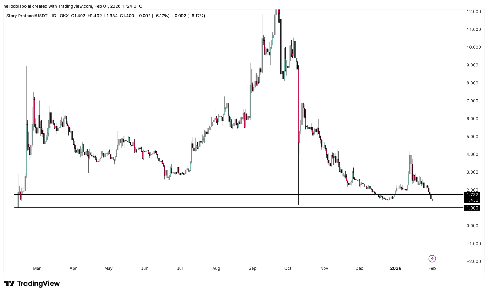 - Story (IP) ist jetzt nur noch eine wichtige Unterstützungsstufe davon entfernt, sein Allzeittief von 1 US-Dollar erneut zu testen, und die Wahrscheinlichkeit, ein neues Tief zu erreichen, steigt.