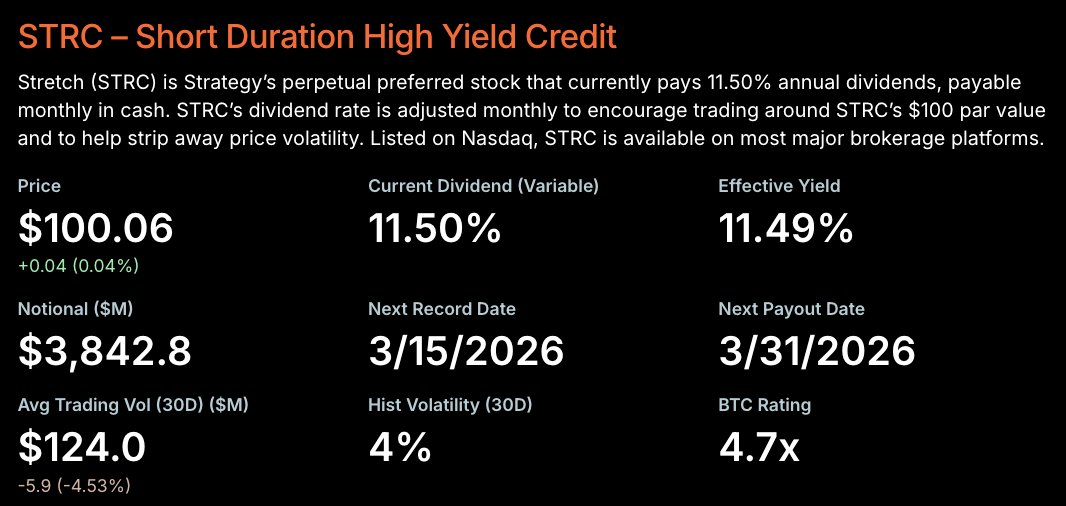 STRC ist die unbefristete Vorzugsaktie mit variablem Zinssatz von Strategy. im Juli 2025 eingeführt als eines von mehreren Wertpapieren, die das Unternehmen neben anderen Geldautomatenprogrammen wie Stride (STRD), Strife (STRF), Strike (STRK) und Stammaktien (MSTR) zur Finanzierung seiner Bitcoin-Treasury-Strategie nutzt. Laut Strategie zahlt die Aktie monatlich variable Bardividenden, wobei die Jahresrate für März auf 11,5 % festgelegt ist.