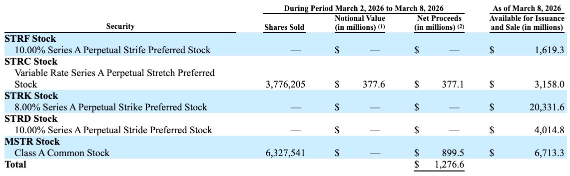 Das Unternehmen berichtete a massiver BTC-Kauf im Wert von 1,3 Milliarden US-DollarDies markiert eine der größten Bitcoin-Akquisitionen aller Zeiten. Der größte Erlös aus den gemeldeten Verkäufen entfiel auf die Stammaktien MSTR, die einen Erlös von fast 900 Millionen US-Dollar generierten.