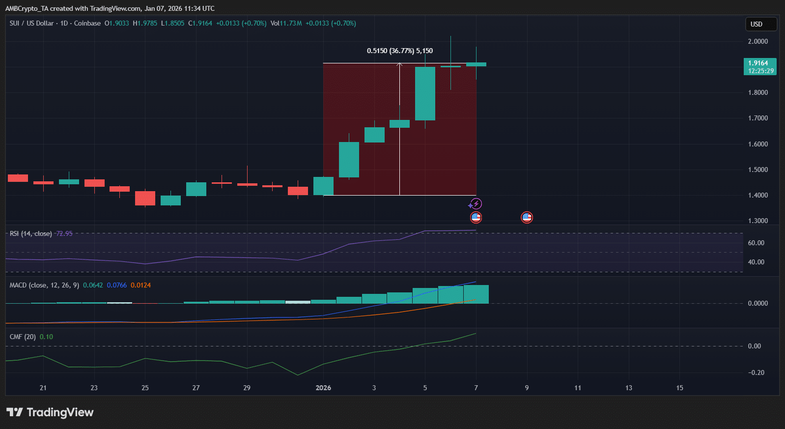 SUI schaffte einen klaren Durchbruch, nachdem wochenlang nichts Besonderes zu verzeichnen war. Der Token stieg innerhalb einer Woche um über 36 % und eroberte die Zone von 1,90 bis 2,00 US-Dollar zurück.