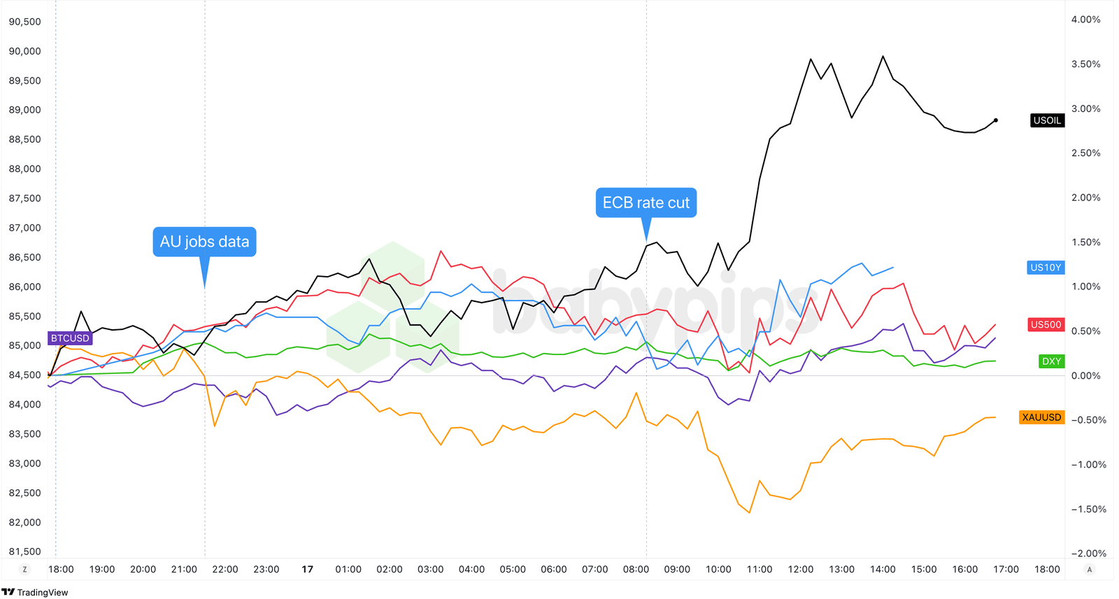 Dollarindex, Gold, S & P 500, Öl, US 10-jährige Ertrag, Bitcoin-Overlay Diagramm von TradingView