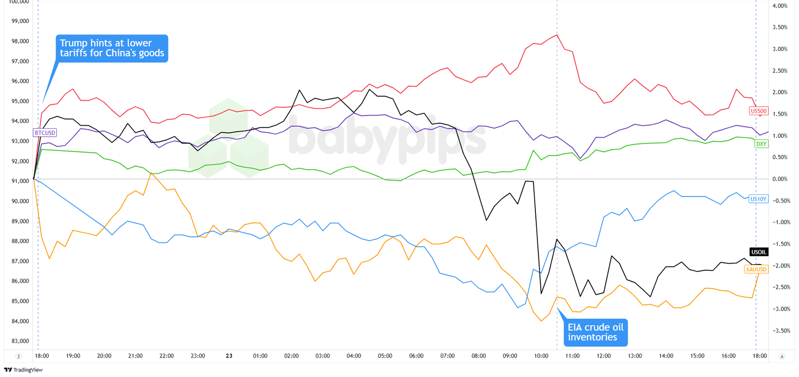Gold Die Preise fielen um 3,7% auf 3.285 US -Dollar, der größte Rückgang seit 2013. Die 10-jährige Staatsausbeute Anfänglich fiel auf 4,26% zurück, bevor sich die Risikostimmung vollständig auf 4,39% umkehrte. US -Öl Die Preise gingen stark auf 62,20 USD zurück, nachdem Reuters gemeldet hatte, dass mehrere OPEC+ -Mitglieder angesichts der internen Streitigkeiten über die Einhaltung von Produktionsquoten beschleunigte Ausgangssteigerungen drängten. Bitcoin zeigte eine relative Stabilität von knapp 94.000 US -Dollar.