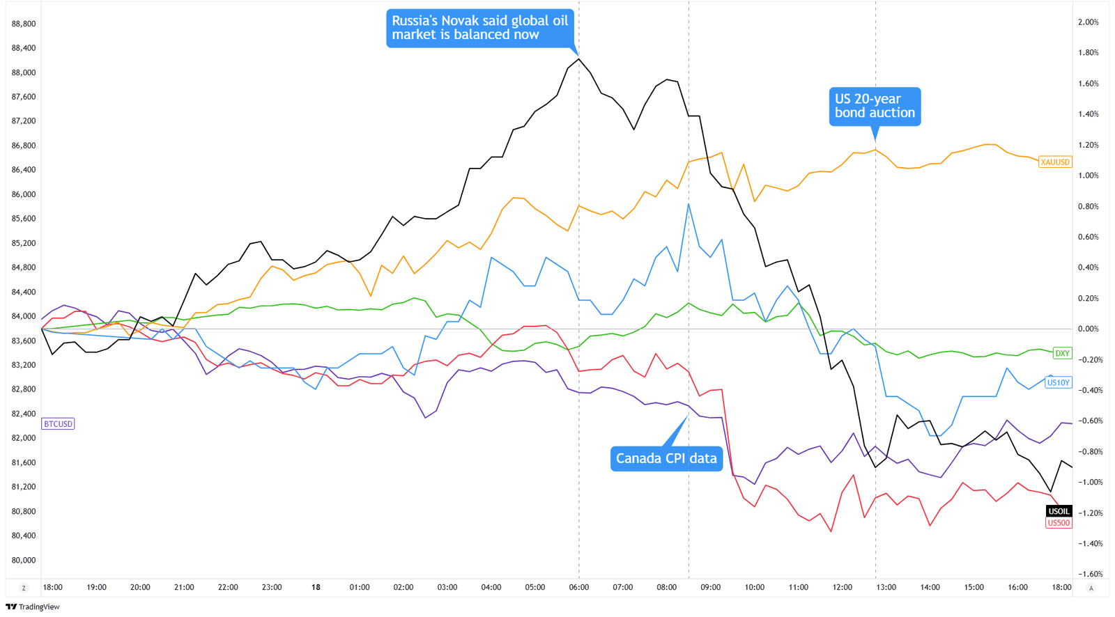 Dollarindex, Gold, S & P 500, Öl, US 10-jährige Ertrag, Bitcoin-Overlay Diagramm von TradingView