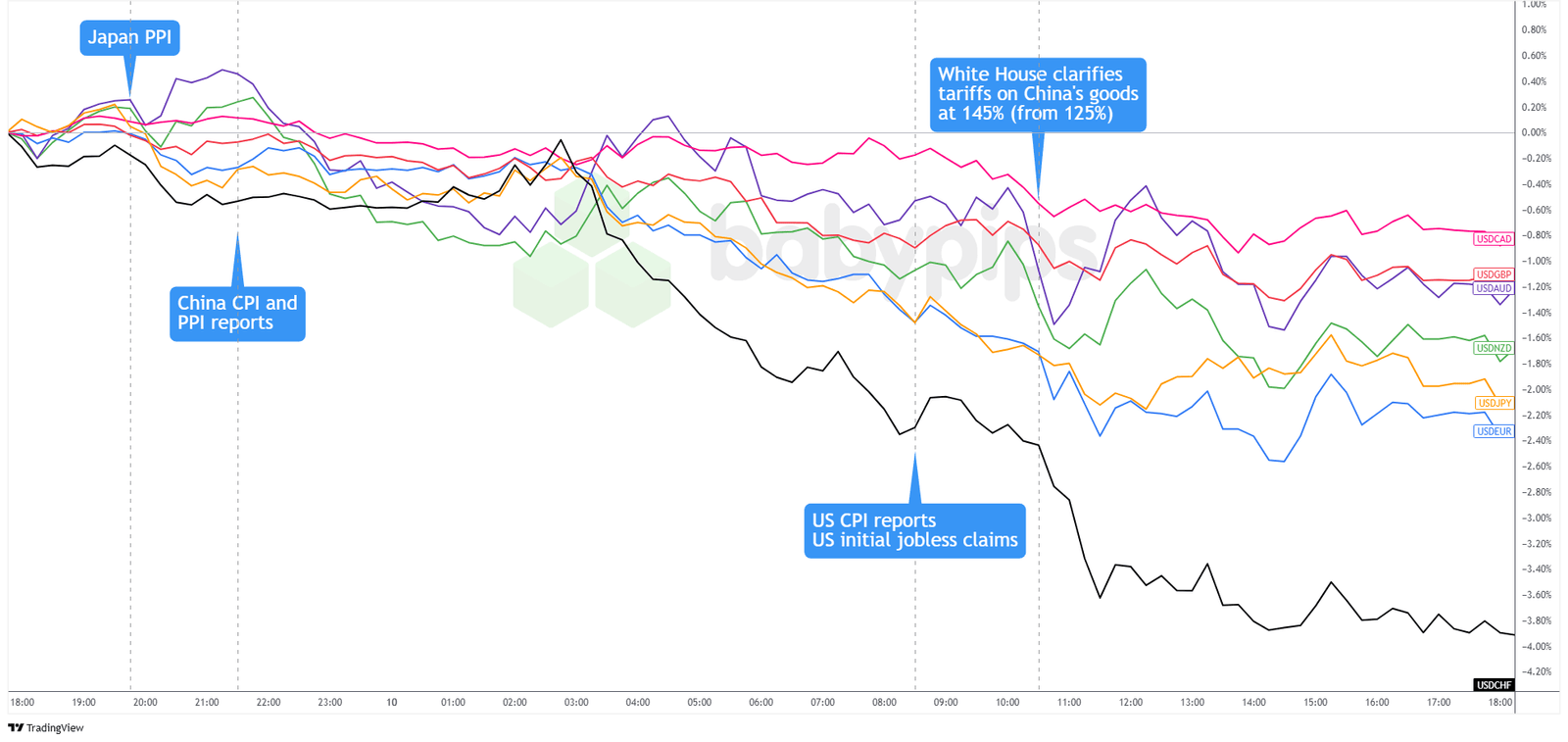 Der wahre Schlag kam, als US -CPI -Daten auf der ganzen Linie verpasste. Die Schlagzeileninflation fiel unerwartet um 0,1%, während sich das Core -CPI kaum bewegte. Der Dollar verkaufte sich stark, insbesondere gegenüber dem Schweizer Franken, der fast 4%zugenommen hat.