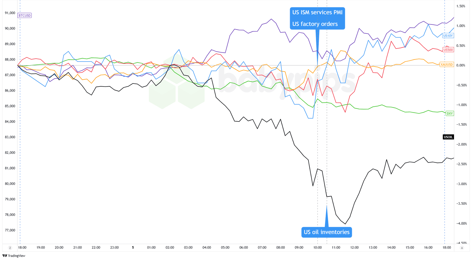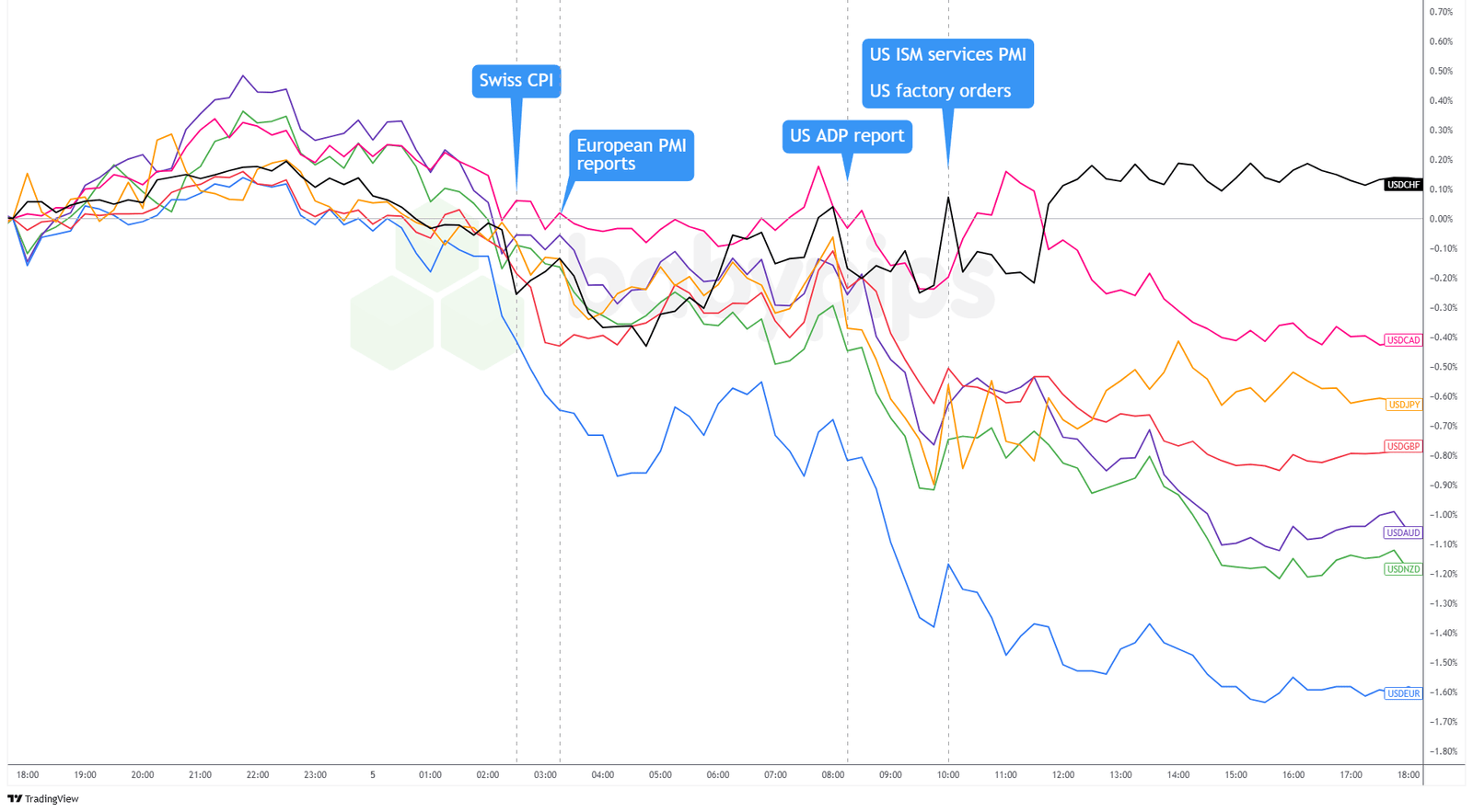 Der größte Treffer kam nach dem US -amerikanischen ADP -Jobbericht, der ein Beschäftigungswachstum des privaten Sektors von nur 77.000 zeigte – weit unter den erwarteten 140.000. Die Händler nahmen dies als Zeichen wirtschaftlicher Schwäche, trotz der stärkeren als erwarteten ISM -Dienste, die folgte.