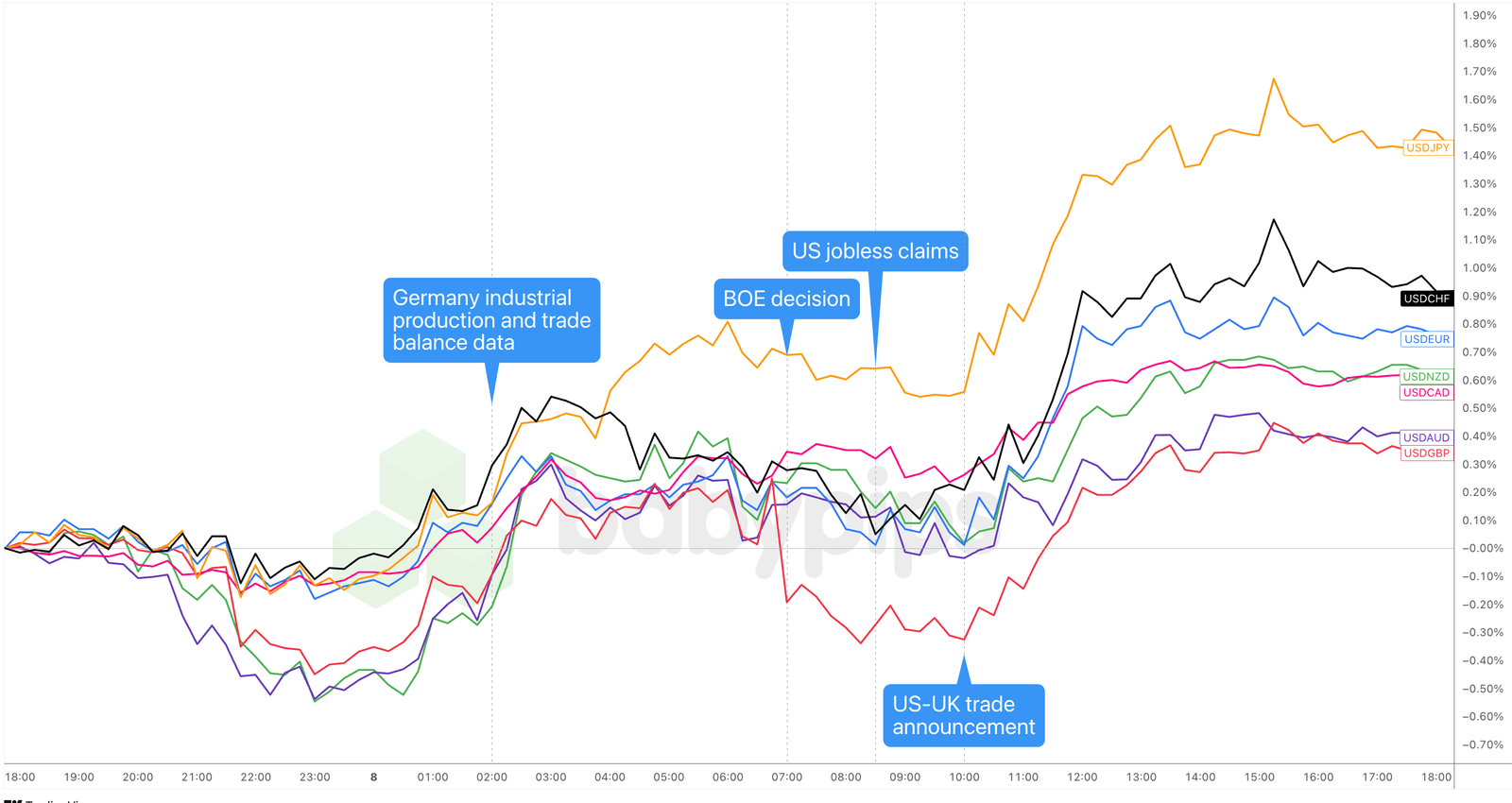Greenbacks Vermögen kehrte sich gegen 9: 00-10: 00 dramatisch um, als Trump den Rahmen des Handelsabkommens der USA-UK festlegte. Diese Ankündigung löste eine sofortige und leistungsstarke Rallye auf der ganzen Linie aus, wobei USD/JPY die dramatischste Aufwärtsbewegung zeigte und ungefähr 1,5%stieg.