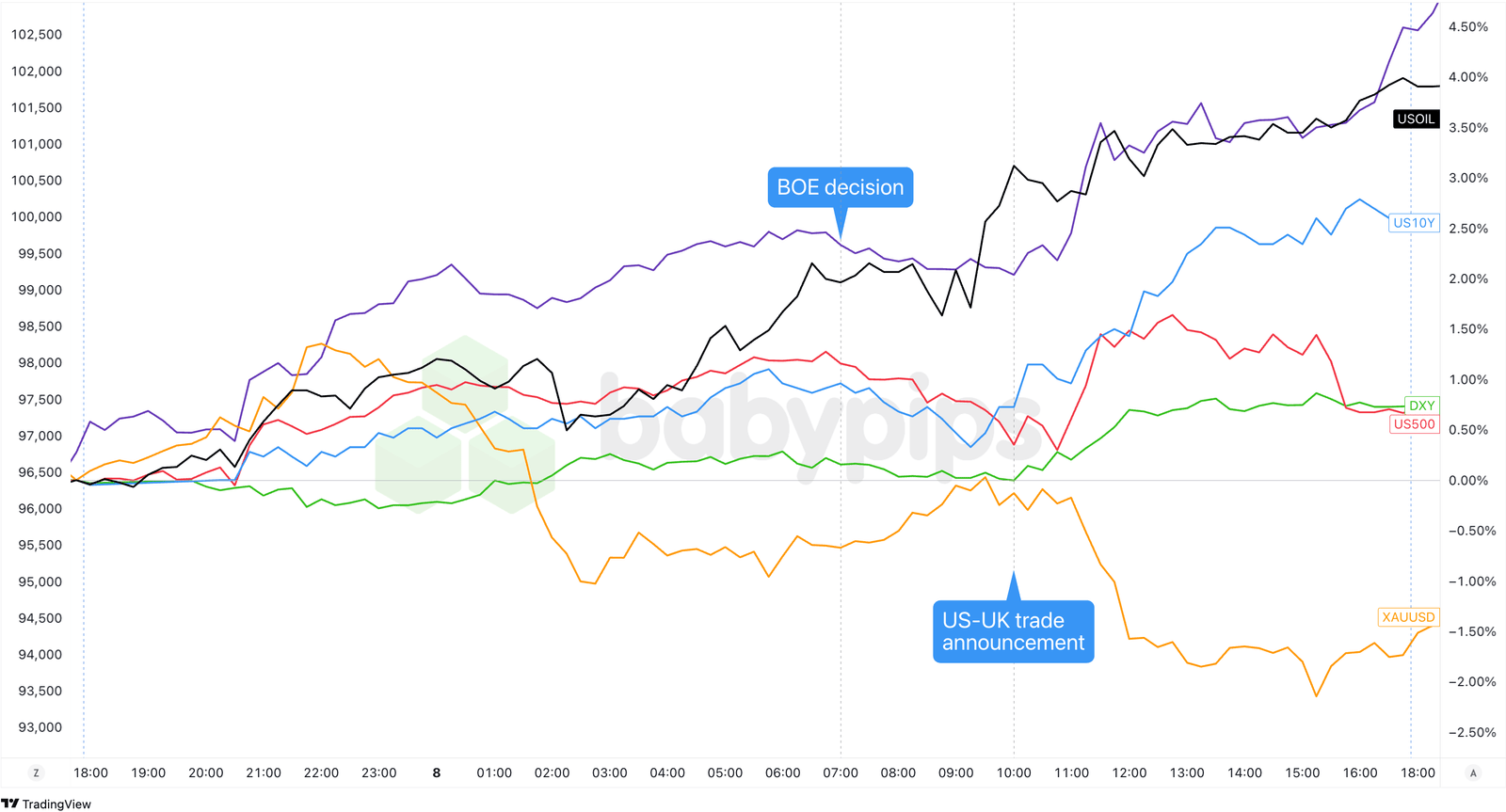 Der heutige US-UK-Handelsrahmen schickte den Dollar, die Aktien und das Bitcoin-Klettern, während Gold als Risikoappetit stürzte.