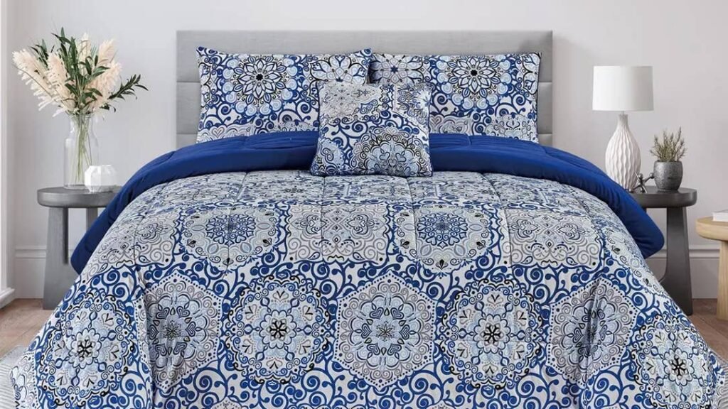 Das Bettdeckenset ist in sieben Farben und drei Größen erhältlich, darunter Twin, Queen und King. Viele der Muster haben einen edlen Look mit Paisley- oder Vierpassmustern. Wenn Sie jedoch das Aussehen klassischer weißer Bettwäsche mögen, ist auch diese erhältlich.