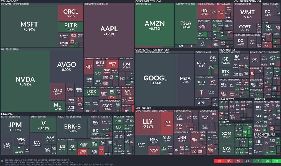 Unter den zyklischen Konsumgütern Amazon (AMZN) zeigt mit einem Plus von 0,73 % weiterhin Widerstandsfähigkeit, was auf eine starke Anlegerstimmung hinweist. Im Finanzbereich JPMorgan Chase (JPM) stieg um 0,22 % und Visum (V) stieg um 0,41 %, was auf eine moderate Positivität hinweist.