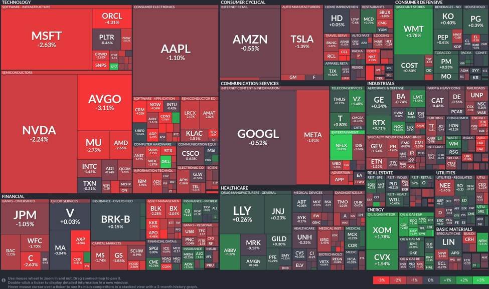 Der heutige Aktienmarkt weist ein komplexes Geflecht aus Trends und Schwankungen auf. Der Technologiesektor steht unter erheblichem Druck, große Player wie Microsoft (MSFT) sind im Rückstand 2,63 % und Nvidia (NVDA) sind Zeugen eines 2,24 % Abfall. Bemerkenswert ist auch, dass Broadcom (AVGO) im Minus liegt 3,11 %was auf einen weit verbreiteten Abschwung im Technologiebereich hindeutet.
