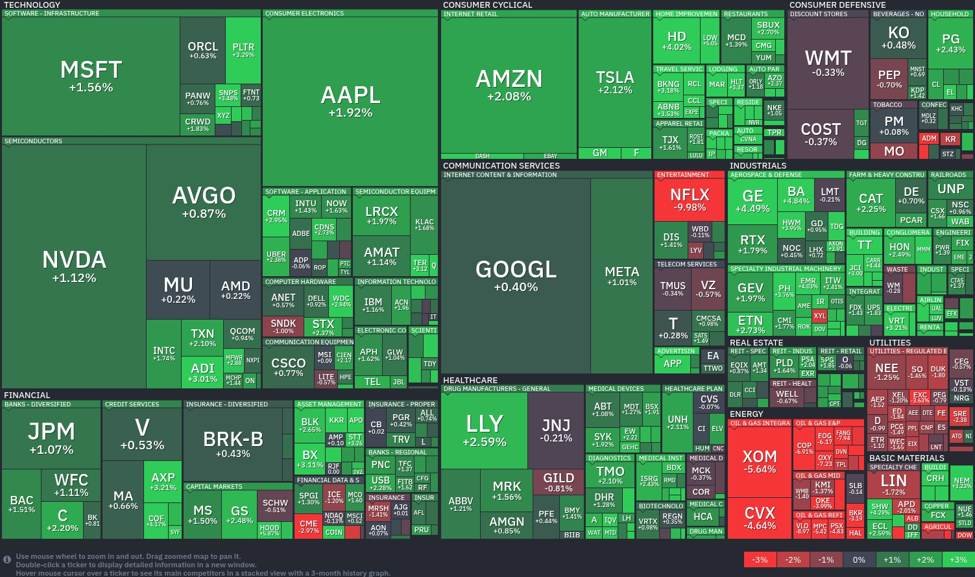 - 🌟 Technologie: Die von Microsoft (MSFT) angeführten Zuwächse, die um 1,56 % zulegten, spiegeln die positive Stimmung in der Software-Infrastruktur wider. Spitzenreiter wie Nvidia (NVDA) und Intel (INTC) verzeichnen ebenfalls ein Wachstum von 1,12 % bzw. 1,74 %, was auf eine starke Leistung im gesamten Halbleitersektor hinweist.