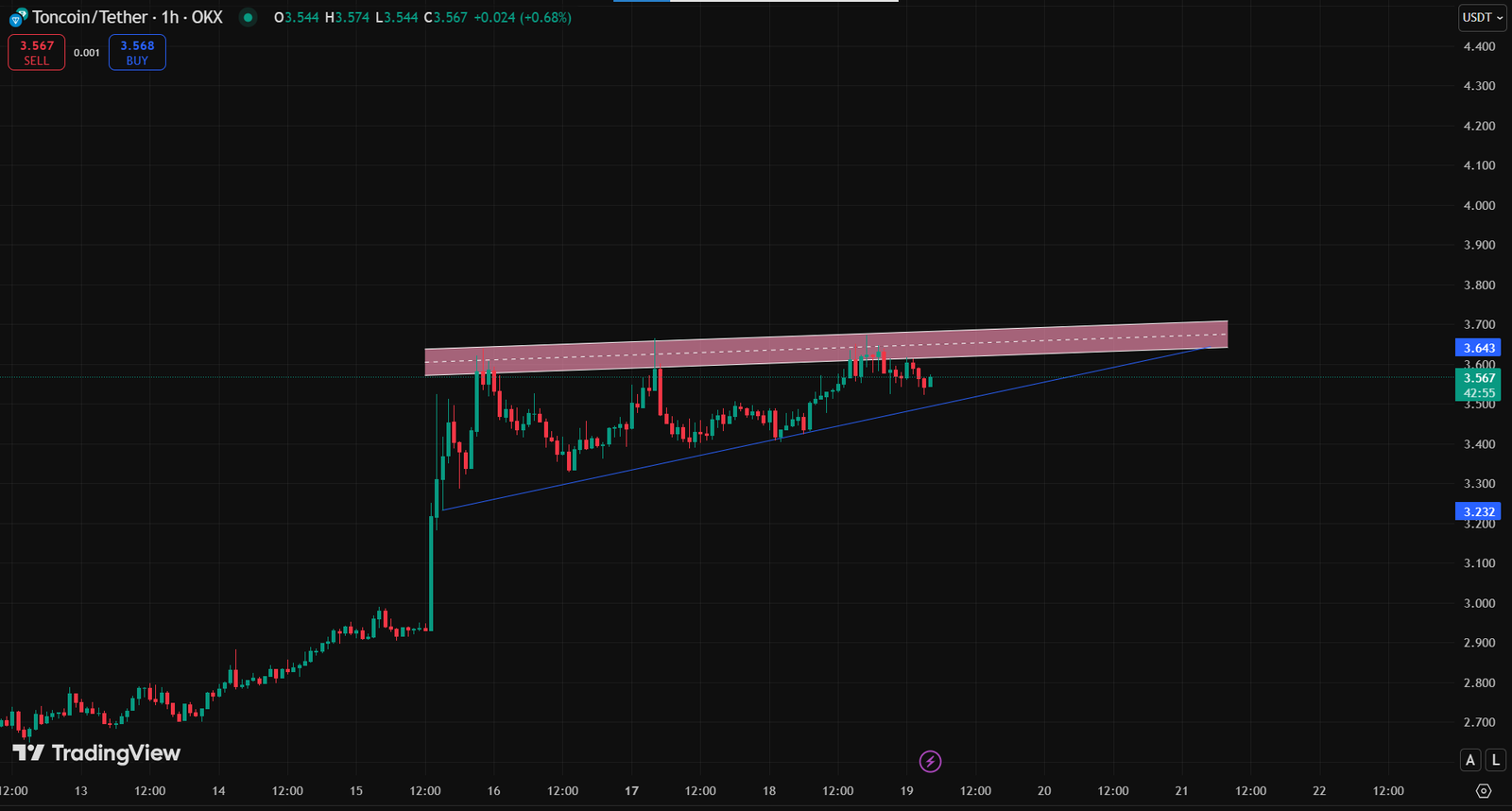 Händler sollten auf die Bewegung von Toncoin innerhalb des aufsteigenden Dreiecks -Musters und der Walaktivität achten. Ein Breakout könnte eine Kundgebung zu 3,90 US-Dollar auslösen, während ein Zusammenbruch zu einer mittelfristigen Preiskorrektur führen kann.