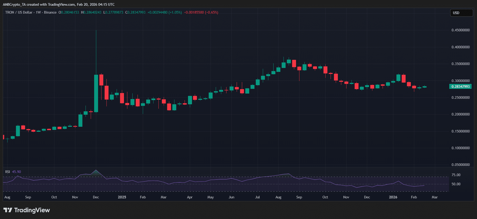 Diese Strategie ist besonders bemerkenswert, da TRX in der Nähe einer kritischen Unterstützung gehandelt wird, die Mitte Dezember 2025 im Laufe des Monats einen Anstieg von fast 15 % auf 0,30 $ auslöste, bevor der Marktcrash 100 % dieser Gewinne zunichte machte.