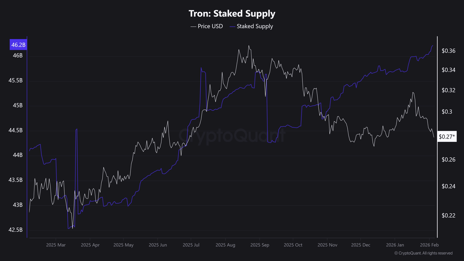 Mit anderen Worten: Ethereum bleibt die zentrale Anlaufstelle für die allgemeine „Liquidität“. Allerdings erreichte der gesperrte TRX gerade einen Rekordwert von 46,2 Milliarden oder 48 % des Gesamtangebots – ein Zeichen dafür, dass TRON still und leise eine starke und belastbare DeFi-Basis aufbaut.