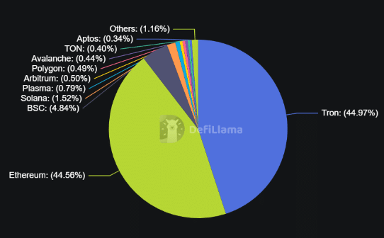 Laut DeFiLlama, TRON [TRX] hat offiziell überholt Ethereum [ETH] in der USDT-Dominanz und eroberte 44,97 % gegenüber 44,56 % von ETH. Dies hat die Vorstellung bestärkt, dass Stablecoins zu einem kritischen Schlachtfeld werden.