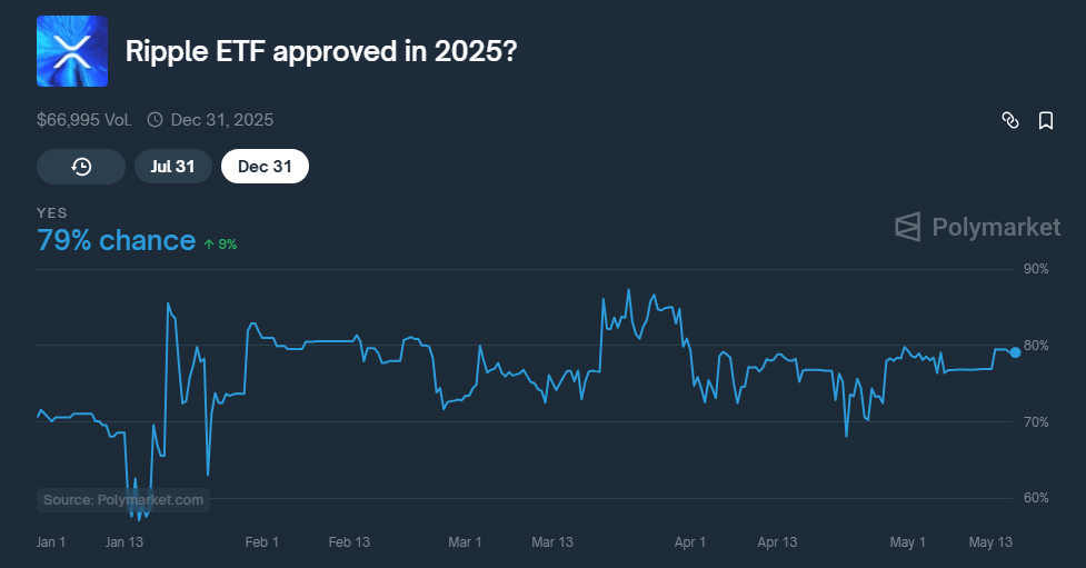 Basierend auf Marktprediction -Plattformen wie Polymarket gibt es eine 79% Chance Die US -amerikanische Securities and Exchange Commission genehmigt den Punkt XRP -ETFs bald.
