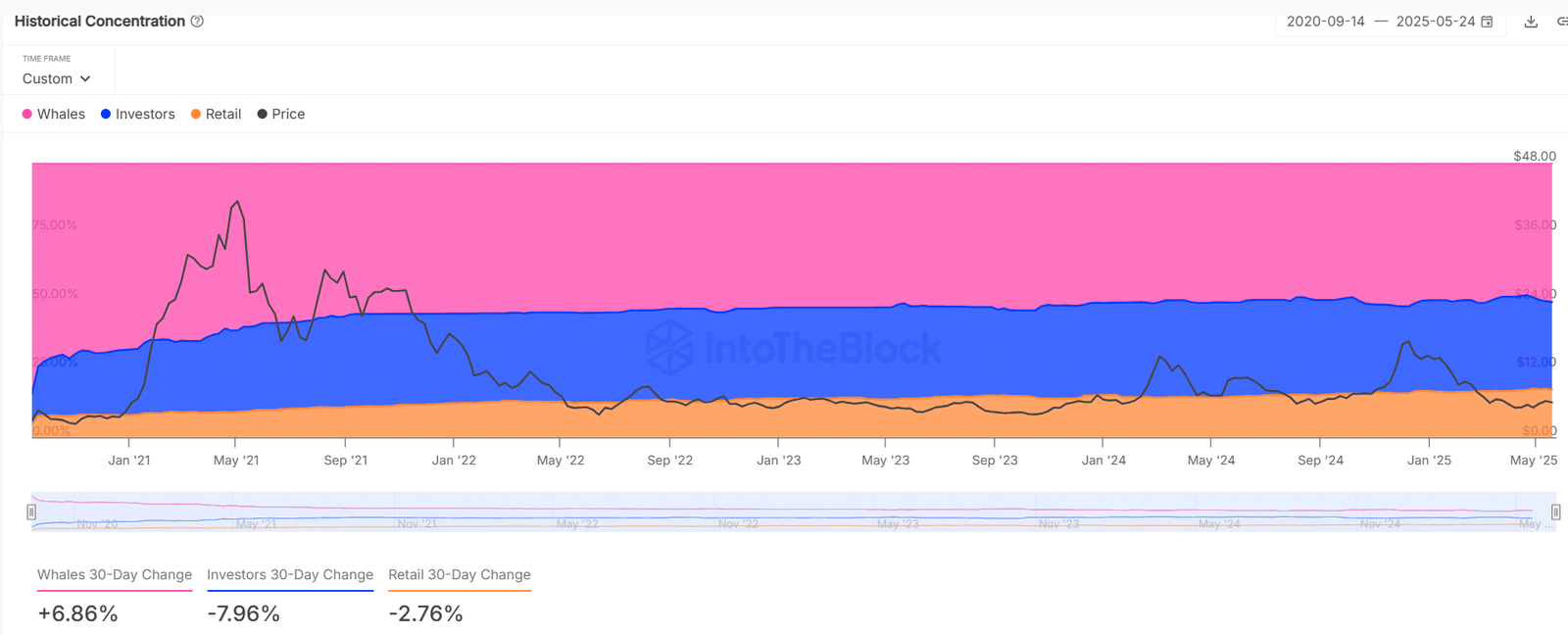 Diese Verschiebung der Inhaberverteilung zeigt, dass große Einheiten ihre Kontrolle über die zirkulierende Versorgung von UNI erhöhen.