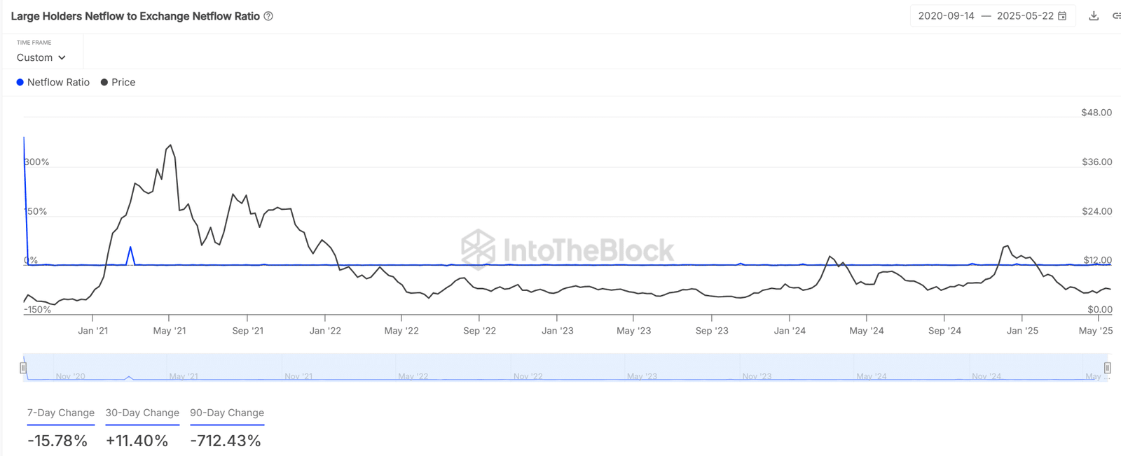Trotz eines kürzlichen 7-tägigen Rückgangs von -15,78% an NetFlows ist das 30-tägige NetFlow-Ratio für große Inhaber um 11,40% gestiegen, was die anhaltende Akkumulation bestätigt.