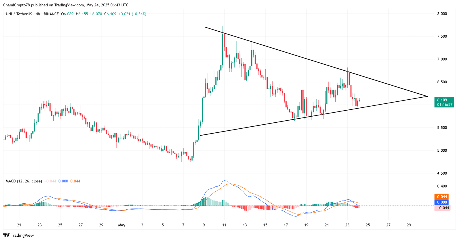 Uni hat sich innerhalb eines symmetrischen Dreiecks auf dem 4-Stunden-Diagramm konsolidiert, das durch niedrigere Höhen und höhere Tiefs gekennzeichnet ist, die zu einem Spitze konvergieren.