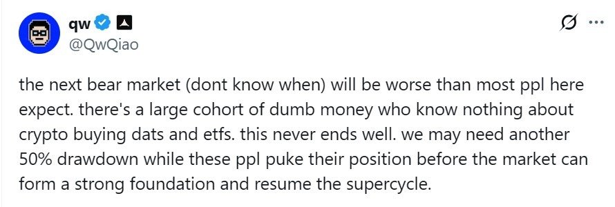 Branchenstimmen sagen, dass der Abschwung möglicherweise nur der Anfang ist. QwQiao, Mitbegründer der Alliance DAO, veröffentlichte seine Warnung im September erneut und argumentierte, dass der nächste Bärenmarkt härter ausfallen könnte als erwartet.