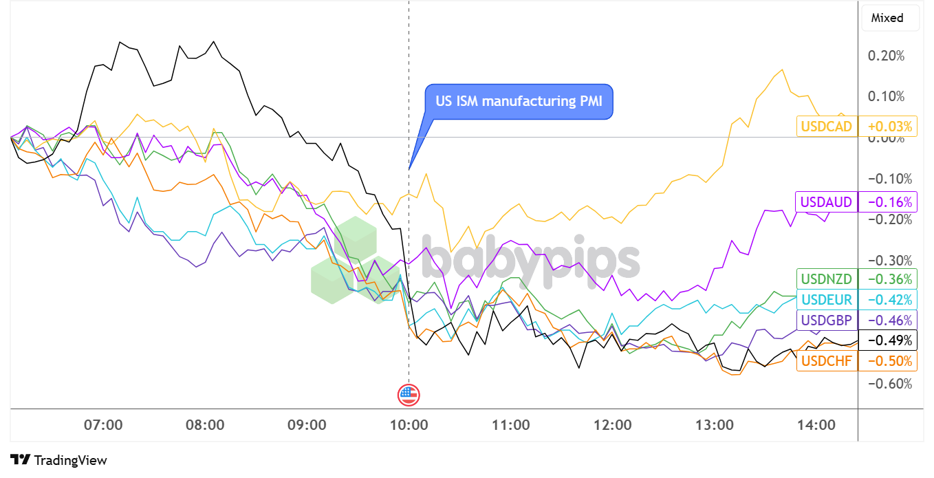 Der US -Dollar, der bereits vor der ISM -PMI -Veröffentlichung niedriger war, schwächte sich nach der Veröffentlichung der enttäuschenden Fertigungsdaten gegenüber den meisten großen Währungen weiter ab.